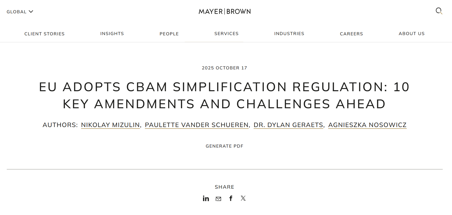 碳关税大地震——欧盟CBAM简化条例生效,50吨豁免门槛重塑中欧贸易新格局2025年10月17日,欧洲议会和理事会于10月8日通过的《(欧盟)2025/2083号条例》(即“CBAM简化条例”)在《欧盟官方公报》上正式公布。该条例是对《(欧盟)2023/956号条例》(即“CBAM条例”)的首次修订,旨在简化并加强碳边...