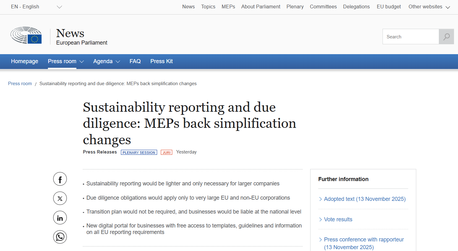 欧洲议会通过CSRD与CSDDD简化方案:企业可持续发展义务的重大调整2025年11月13日,欧洲议会通过了Omnibus I文件,即简化企业可持续发展报告指令(CSRD)和企业可持续发展尽职调查指令(CSDDD)的立法方案。这一举措不仅标志着欧洲议会与极右翼团体在可持续发展立法上首次达成共识,也为企业减轻合规负担铺平...