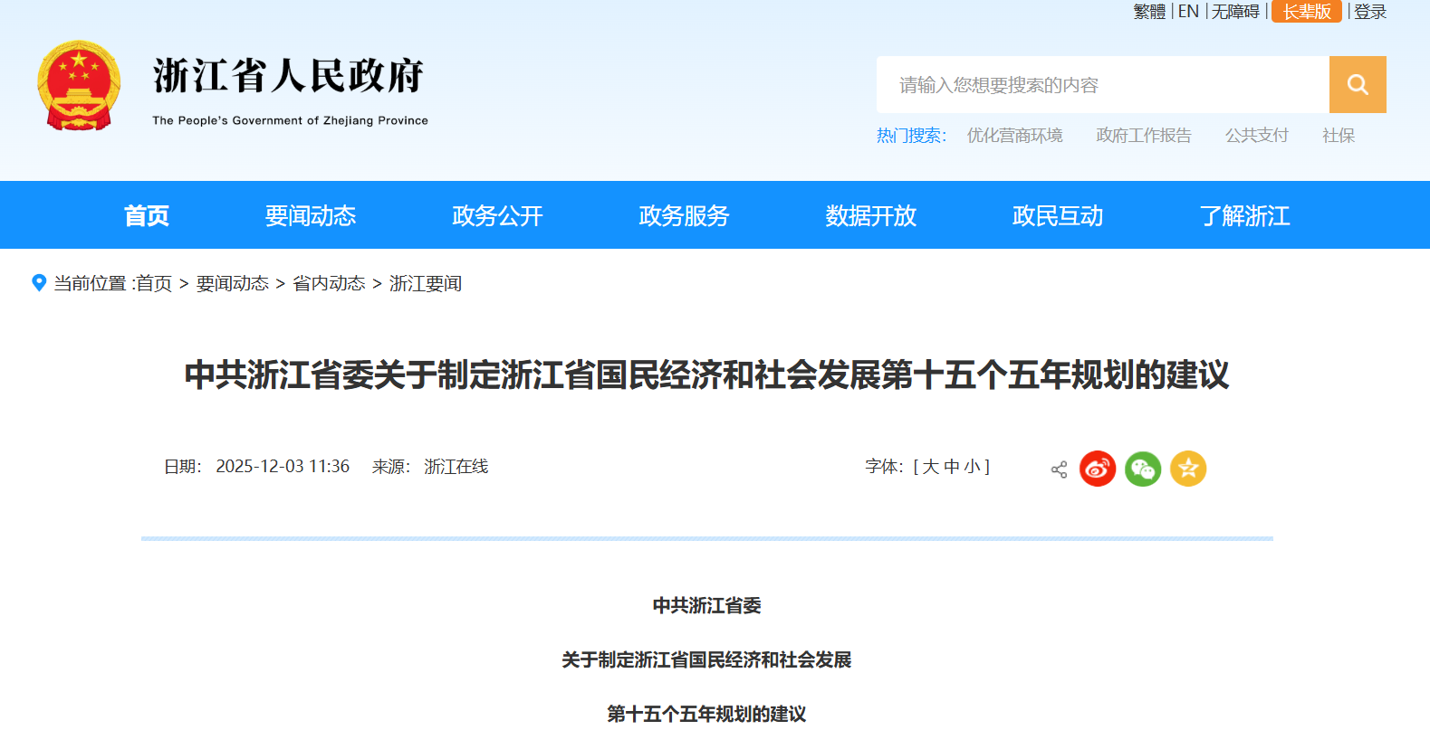 2025年12月3日,中共浙江省委正式发布了《关于制定浙江省国民经济和社会发展第十五个五年规划的建议》。这一纲领性文件不仅系统擘画了未来五年浙江经济社会发展的宏伟蓝图,更将生态文明建设和绿色低碳发展提升到前所未有的战略高度。作为“两山”理念的发源地,浙江在此次规划中进一步彰显了先行示范的决心与担当,明确将“加快建设更高...