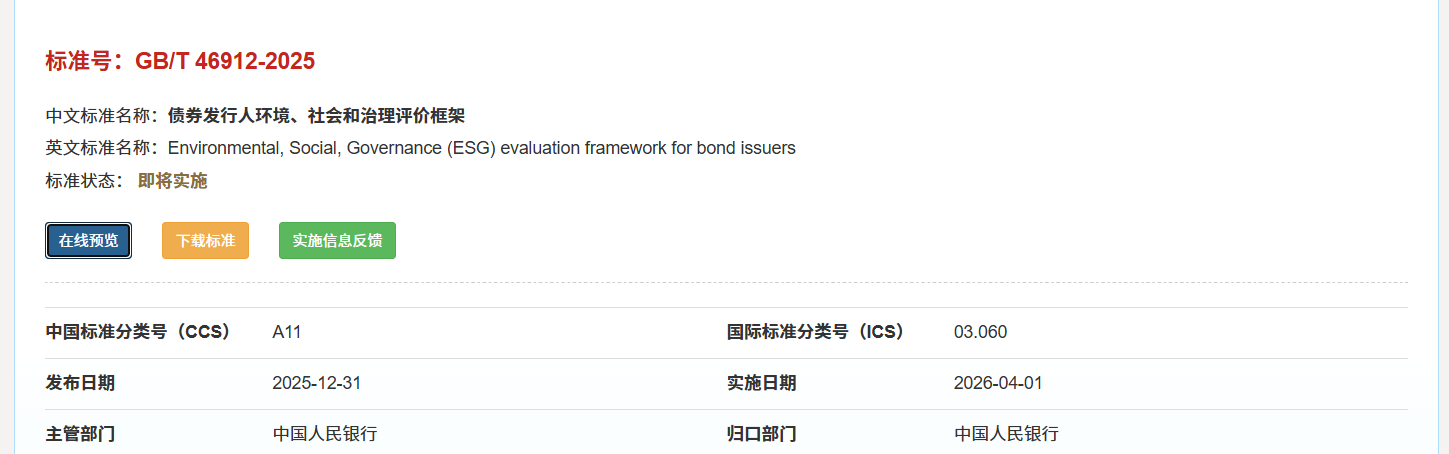 近日,国家市场监督管理总局(国家标准化管理委员会)正式发布了《债券发行人环境、社会和治理评价框架》(GB/T 46912-2025,以下简称《框架》)推荐性国家标准,并定于2026年4月1日起实施。该《框架》由中国人民银行主管,并由中央国债登记结算有限责任公司牵头,联合中国证监会、国务院国资委研究中心等共16家机构共同起草完成,是我国金融领域首部以ESG命名的国家标准,标志着中国可持续金融标准体系建设迈出了关键一步。