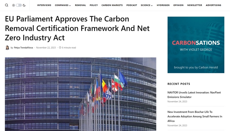 (图片来自互联网)碳去除认证框架和净零工业法案 CRCF AND NZIA11月21日,欧洲议会 (European Parliament,EP) 全体会议投票支持工业、研究和能源 (Industry, Research and Energy ,ITRE) 以及环境、公共卫生和食品安全 (Environment, Pu...