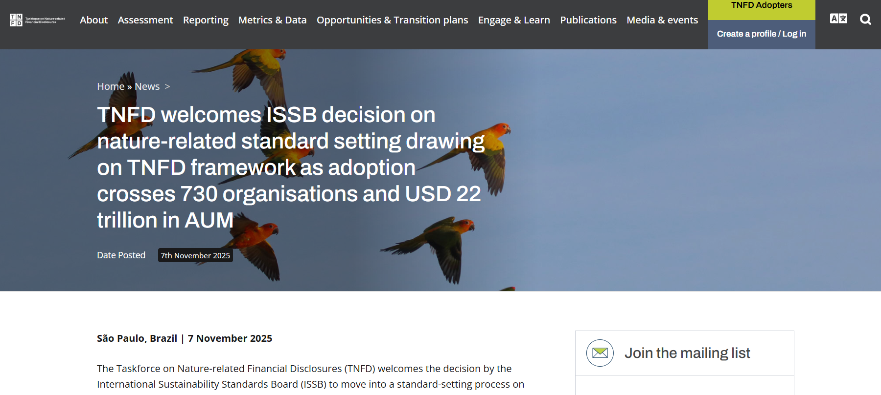 2025年11月初,国际可持续发展准则理事会(ISSB)宣布将基于自然相关财务信息披露工作组(TNFD)框架,制定自然相关风险与机遇的披露标准,并计划在2026年10月前发布征求意见稿。这一决定标志着自然信息披露即将进入全球标准化的新阶段。与此同时,TNFD宣布将于2026年第三季度完成所有现行技术工作,并暂停开发新的...
