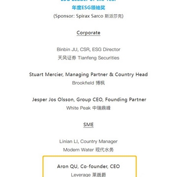 Finalist ESG Leadership AwardRecently, Aron Qu Weifeng of Leverage was shortlisted for the ESG Leader of the Year Award at the ESG China Awards hosted by the British Chamber of Commerce in Shanghai. T